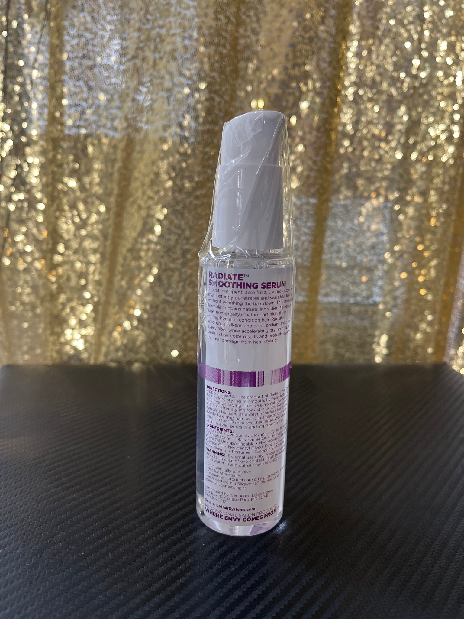A heat intelligent, zero freeze, UV protected elixir that instantly penetrates and seals hair follicles without weighing the hair down. This innovative formula contains natural ingredients (residue free non-greasy) that impart high shine, strengthen and condition hair. Radiate smoothes, silkens and adds brilliant shine to every fiber while accelerating drying time. It seals in hair color results and protects against thermal damage from heat styling.